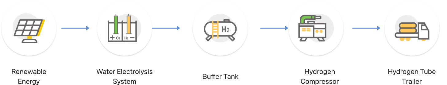 Produces 99.999% high-purity green hydrogen by electrolyzing water using renewable energy sources (hydropower, solar, and wind), and supplies it reliably to hydrogen refueling stations.